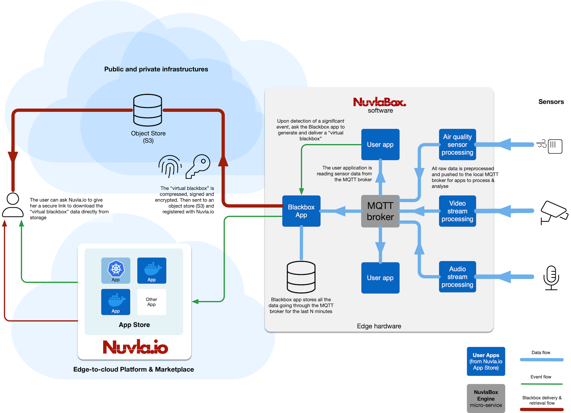 Edge computing systems work in a semi-autonomous way, which is great for providing fast responses, no privacy intrusion and reduced costs from network and cloud storage. But when an incident occurs, you want to archive to the cloud as much data as possible to give you insights into what led to this incident: enter the Blackbox app.